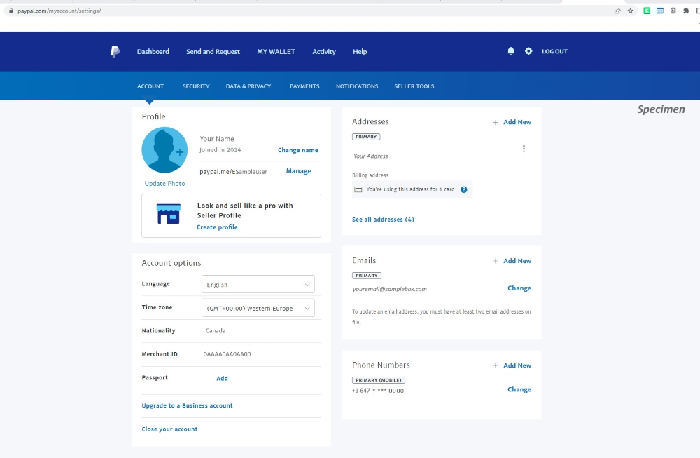 - A legible and clear desktop or mobile screenshot of the 'Account' screen when logged in to your account, showing your name, address, email, and Merchant or Vendor ID (if your Paypal has one).